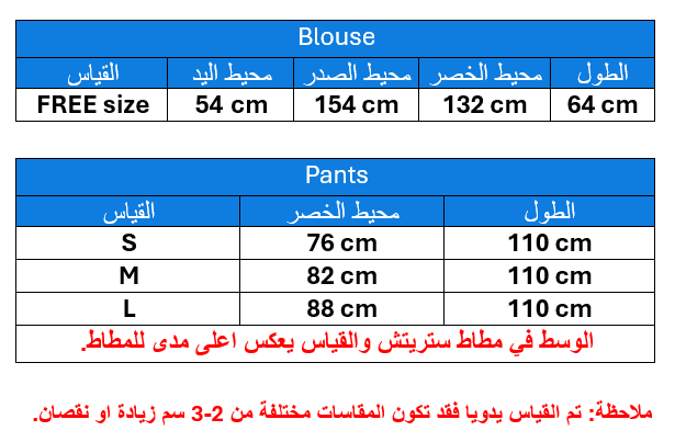 - نوع المنتج : بدلة مكونة من قميص و بنطلون فضفاضين