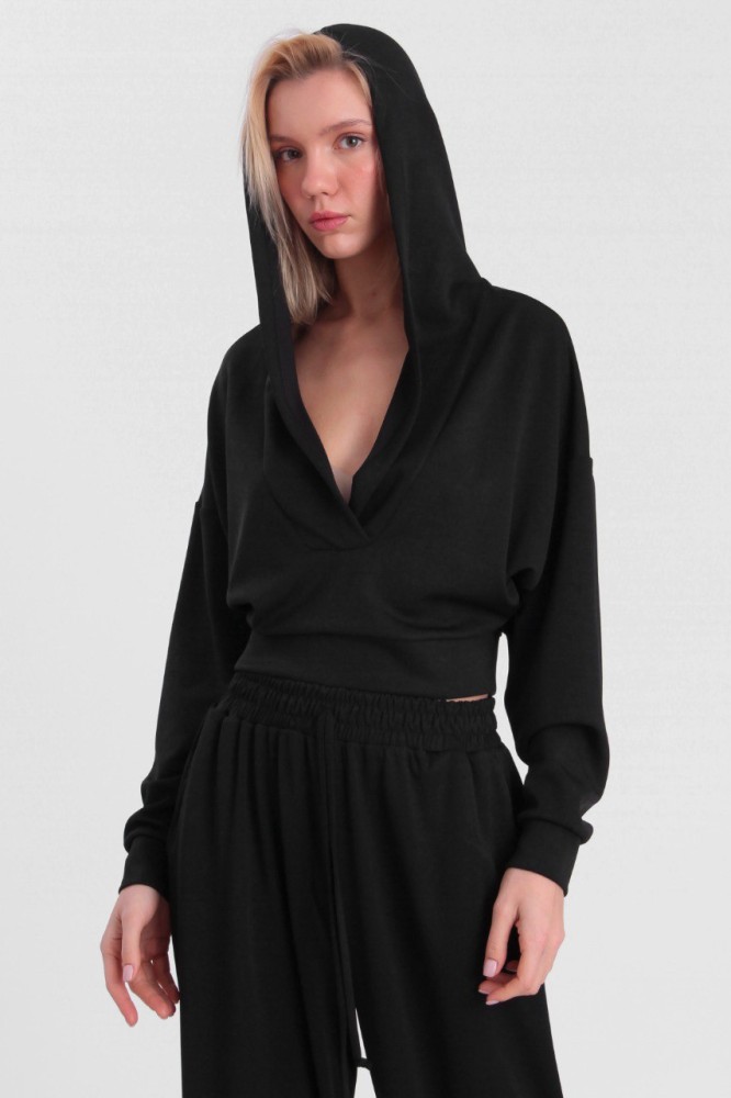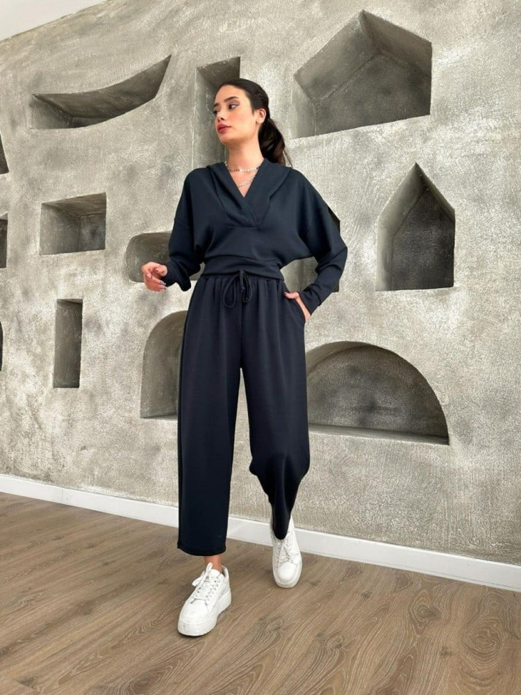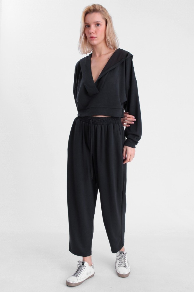 تعتبر بدلة نسائية سوداء المكونة من قطعتين، كروب توب وبنطلون فضفاضين، خيارًا رائعًا للنساء اللواتي يبحثن عن الأناقة والراحة في آن واحد ومثالية للارتداء اليومي وللمناسبات غير الرسمية.