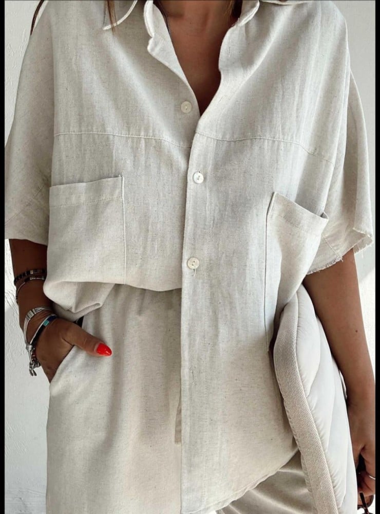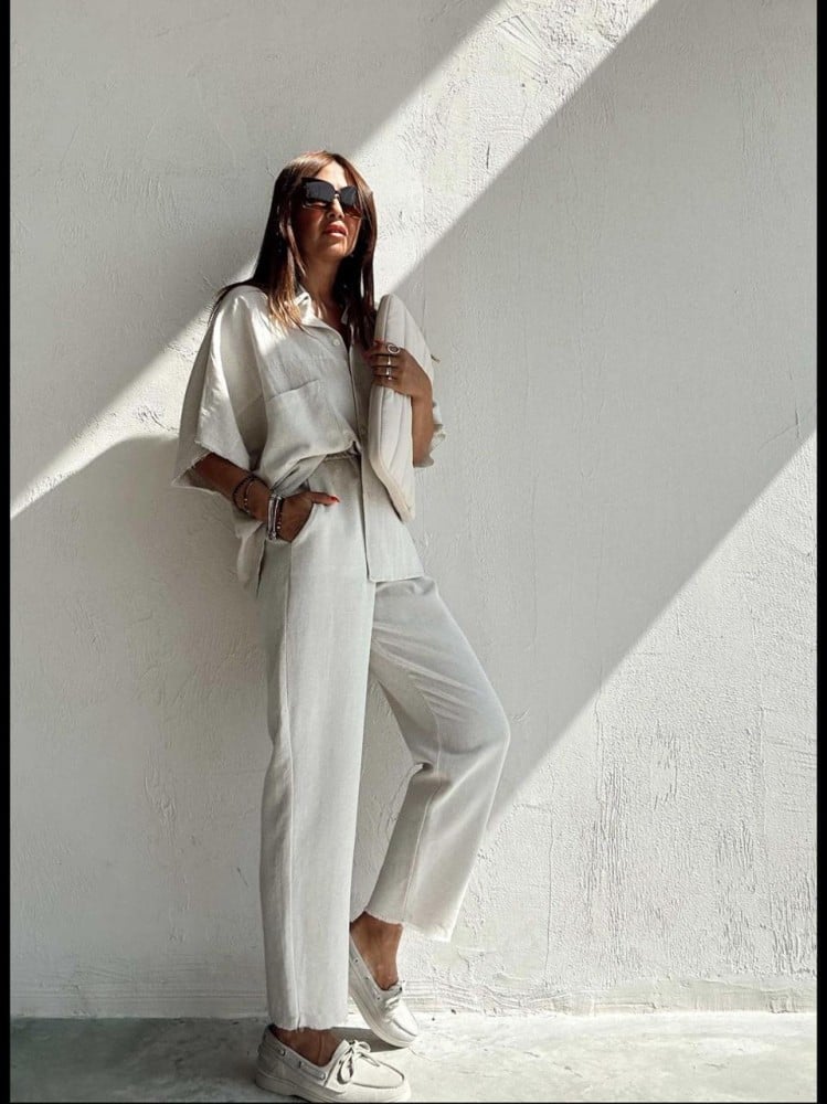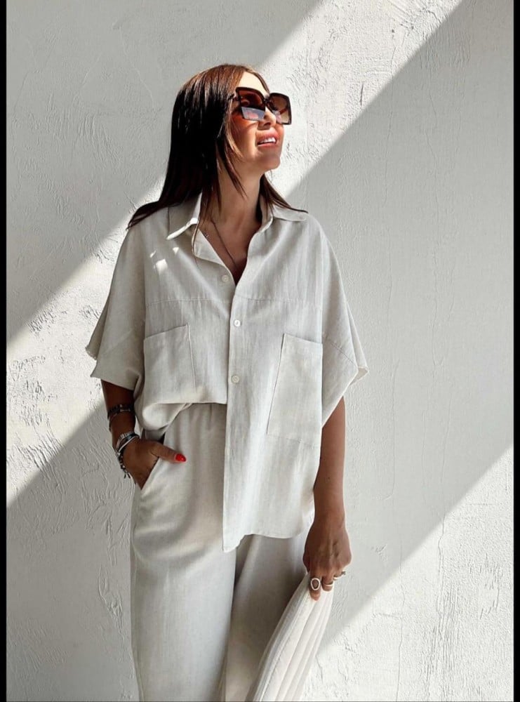 طقم نسائي قطعتين من قميص و بنطلون فضفاضين الخيار الأمثل للنساء اللواتي يبحثن عن الأناقة والراحة في آن واحد,مما يجعلها قطعة لا غنى عنها في خزانة ملابسك. مصممة بعناية لتناسب مختلف الأوقات والمناسبات.