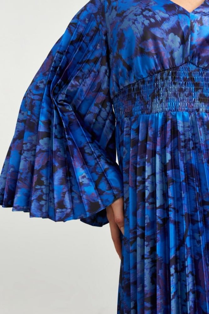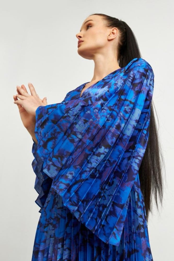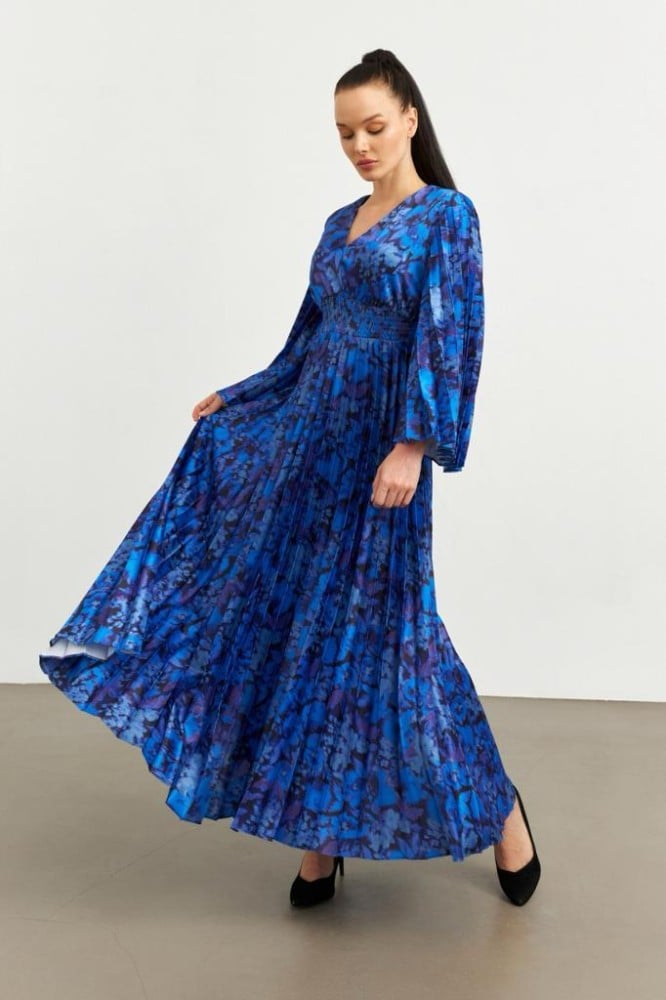 • التصميم: فستان ازرق طويل بكسرات وواسع