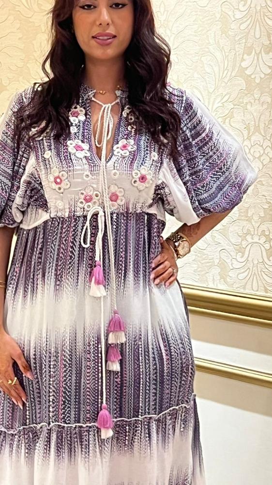 التفاصيل المطرزة يدويًا بالزهور تضيف لمسة فنية مميزة، في تصميم أنثوي واسع وأنيق.