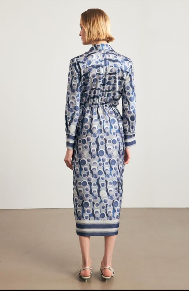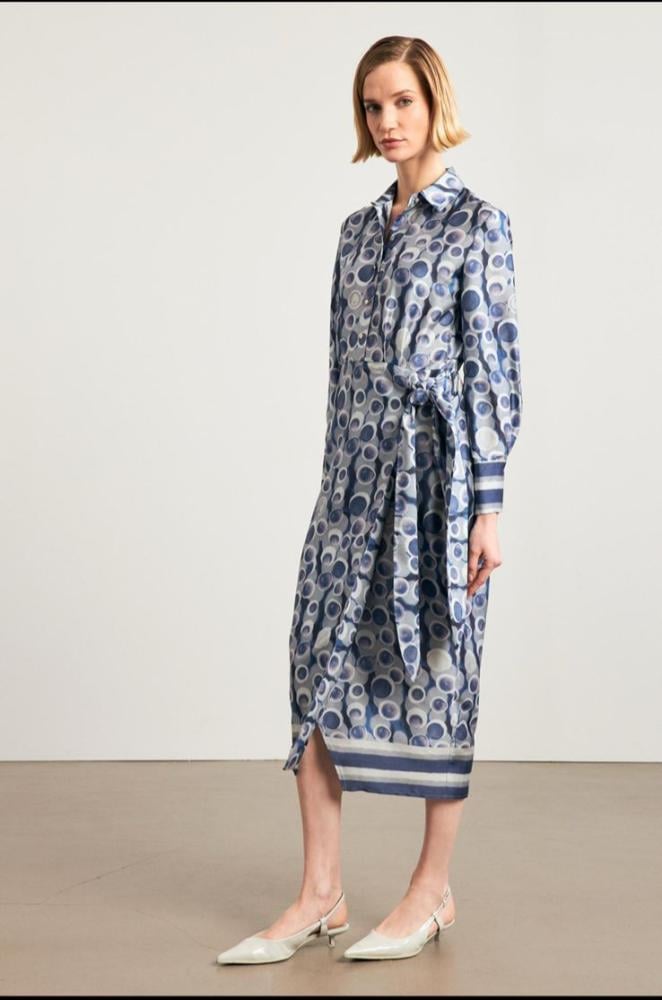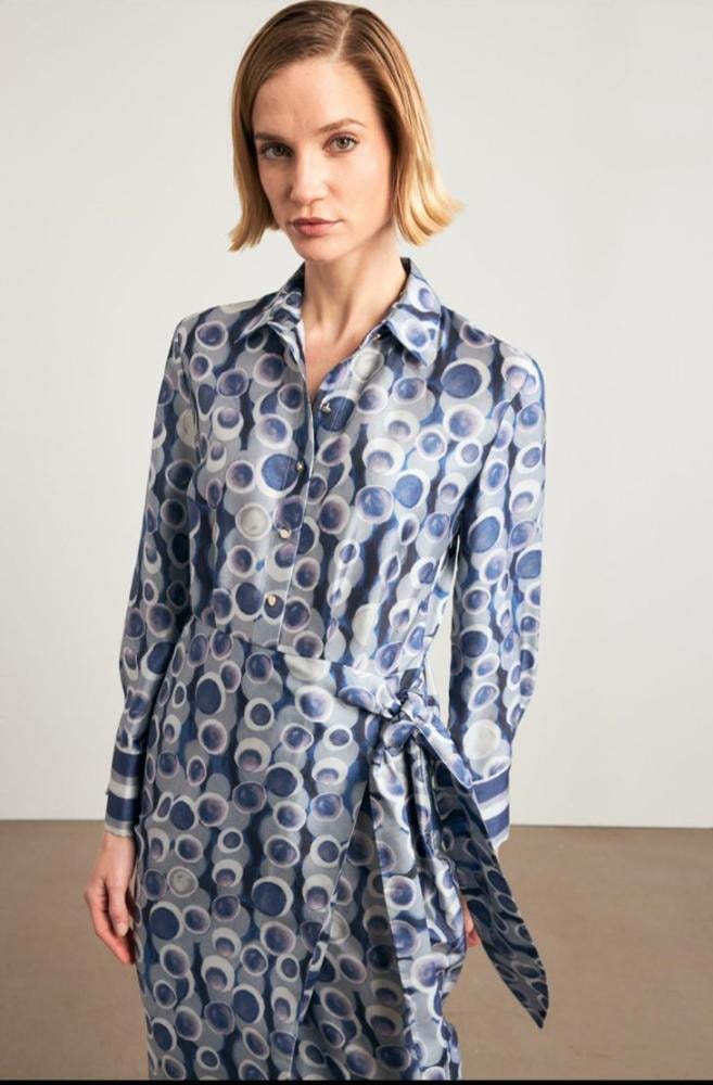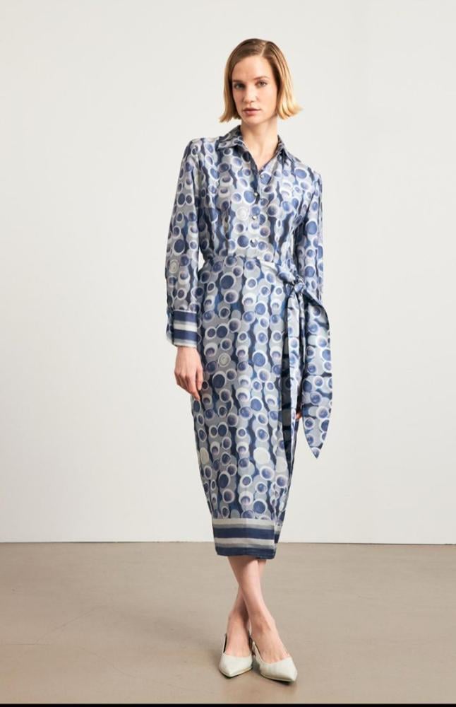 فستان بقصة ميدي ناعمة، يتميز بطبعة دائرية أنيقة بالدرجات الزرقاء الهادئة، مع تفاصيل ياقة كلاسيكية وأكمام طويلة تضيف لمسة من الرقي. مزوّد بربطة جانبية تضبط الخصر وتمنح الجسم شكلاً أنثويًا جذابًا.