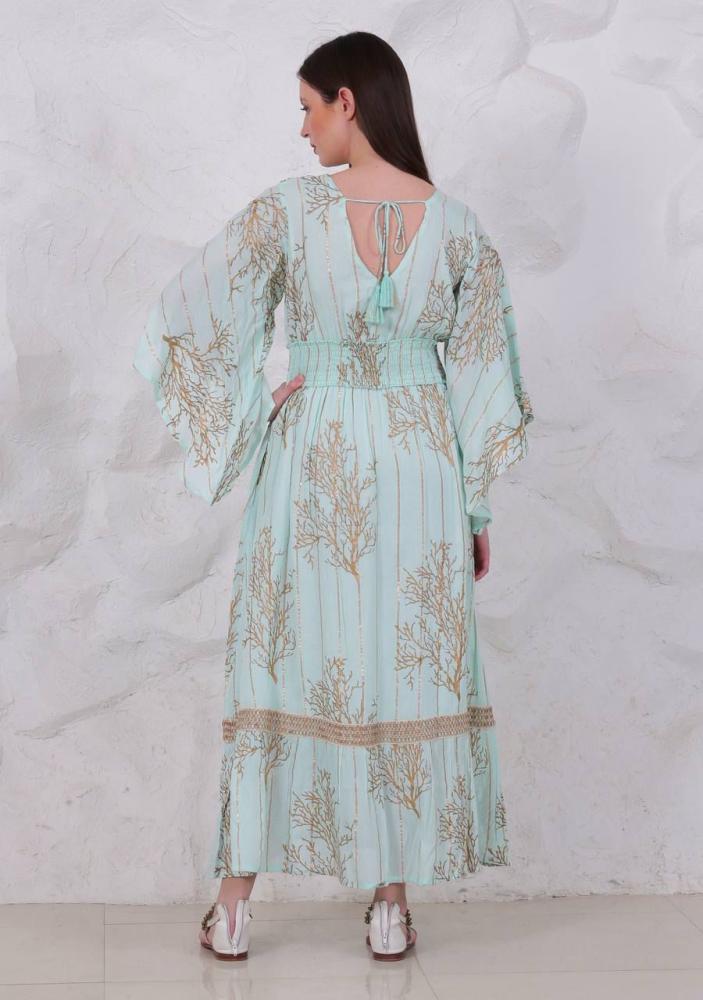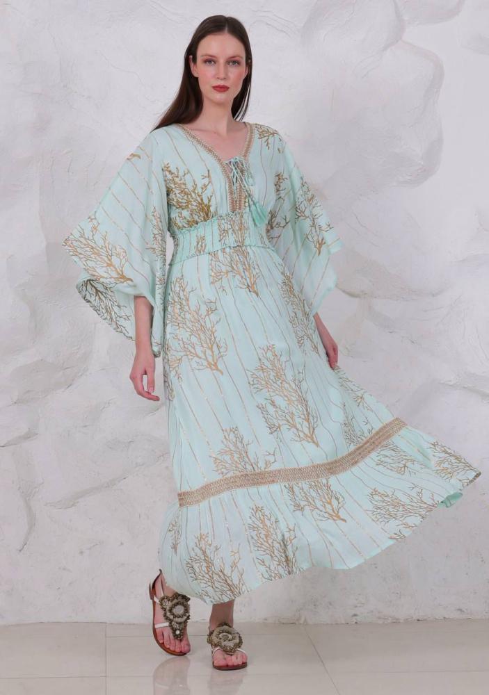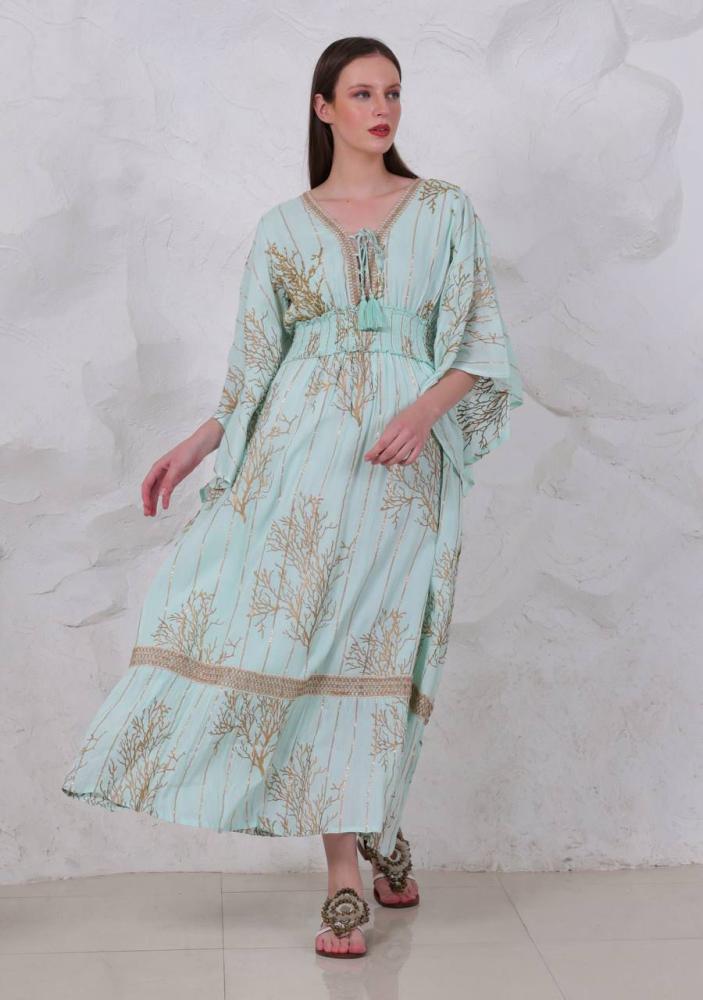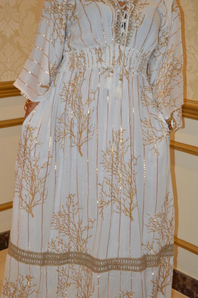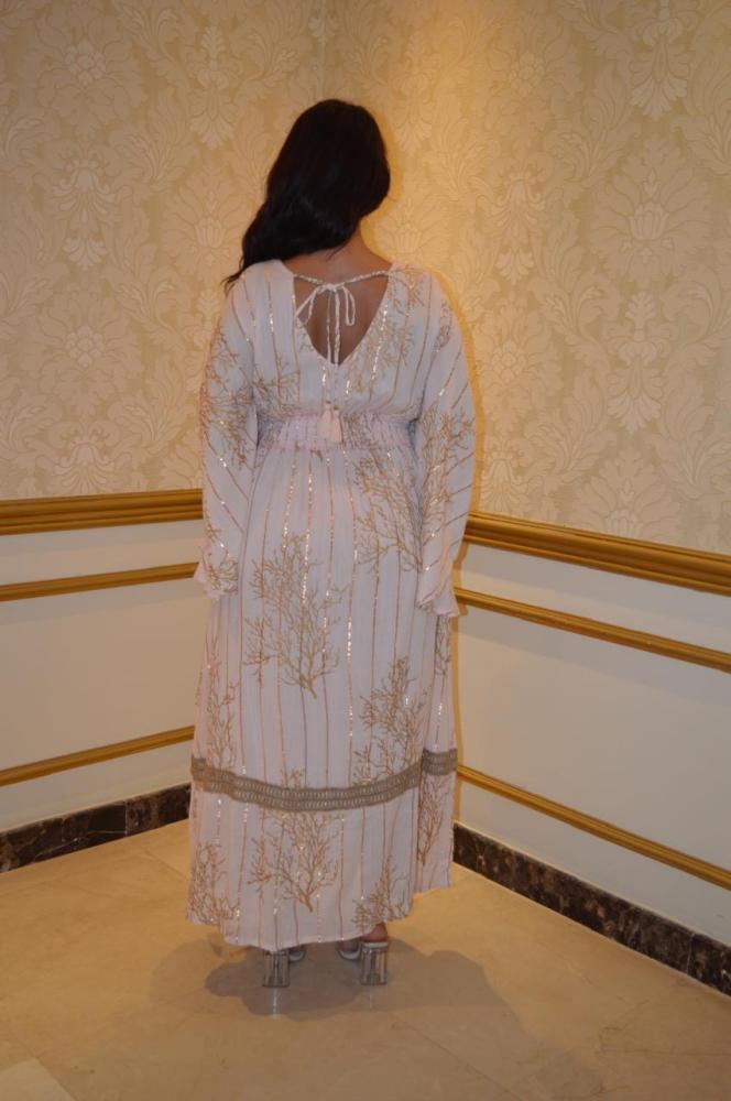 تميّزي بإطلالة فاخرة مع هذا الفستان الطويل المصنوع من قماش خفيف وانسيابي، مزين بتطريز يدوي فاخر بنقوش ذهبية مستوحاة من الطبيعة. يتميز بقصة واسعة مريحة، أكمام فضفاضة، ورباط خصر أنيق يبرز جمال القوام.