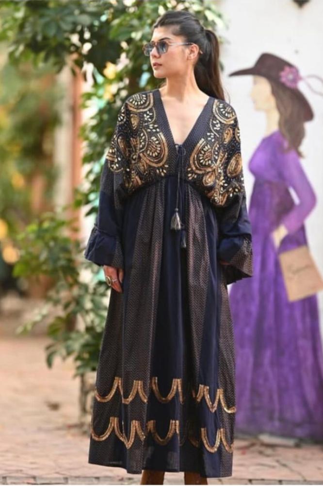 صُمم الفستان من خامات هندية عالية الجودة تمنحك راحة وأناقة في آنٍ واحد، ويزدان بتطريز يدوي مذهل يعكس الحرفية والفن الشرقي الأصيل. يتميز بتفاصيل ذهبية أنيقة على الكتف والصدر والحاشية، مما يجعله قطعة مثالية للمناسبات الخاصة واللمسات الفاخرة في إطلالتك.