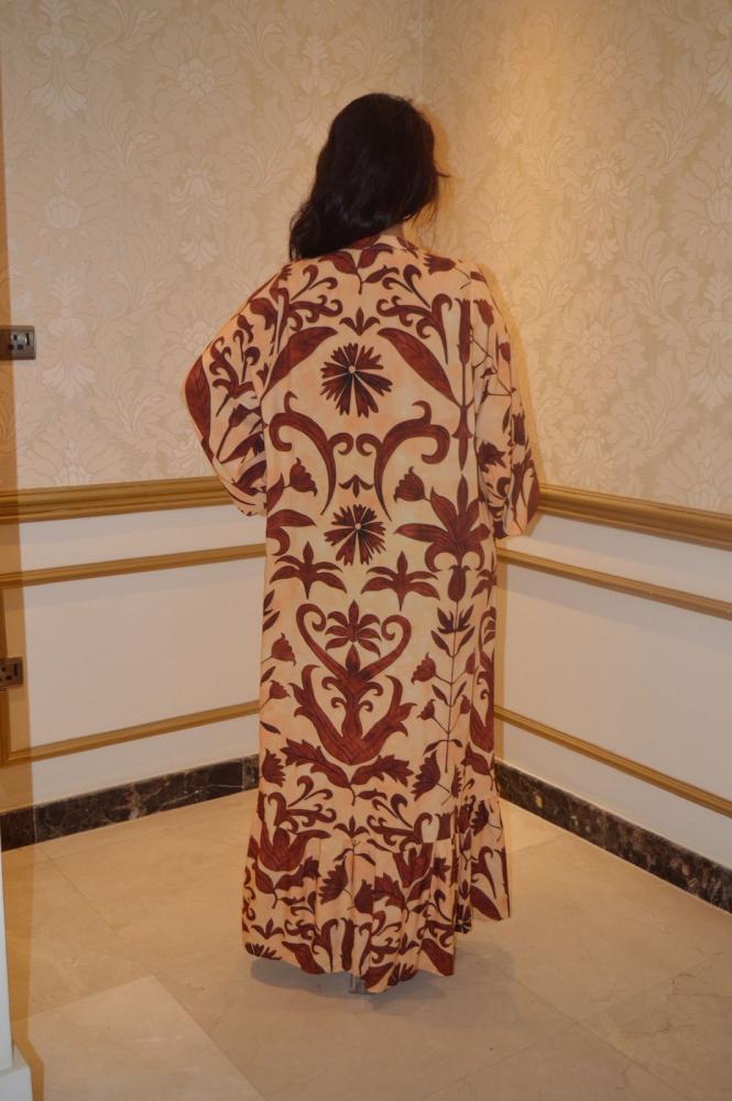 فستان مهيرة يأخذك في رحلة دفء وأناقة مستوحاة من الطبيعة. تصميم واسع وانسيابي، بأكمام طويلة تضيف حضورًا هادئًا ومهيبًا. النقشة النباتية الغنية على أرضية بيج دافئة تمنح الفستان طابعًا تقليديًا فاخرًا، بينما القصة المريحة تضمن لك حرية الحركة وجمال الإطلالة. قطعة مثالية للزيارات الرسمية أو جلسات الظهيرة، لمن تبحث عن الجاذبية من دون ضجيج.