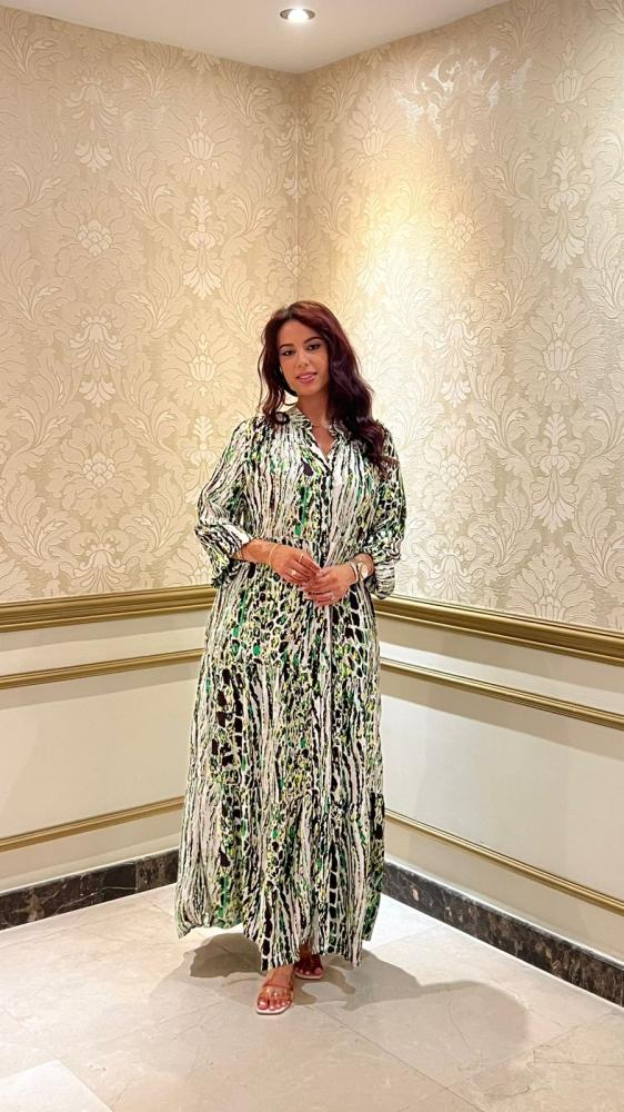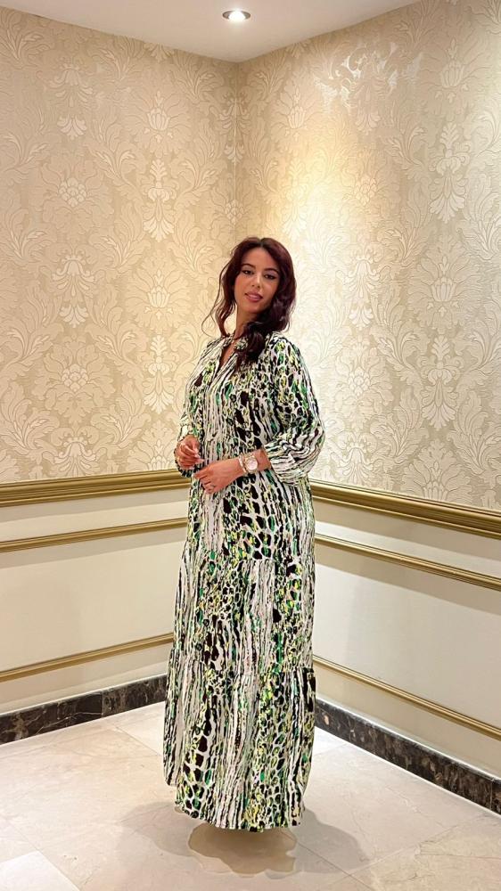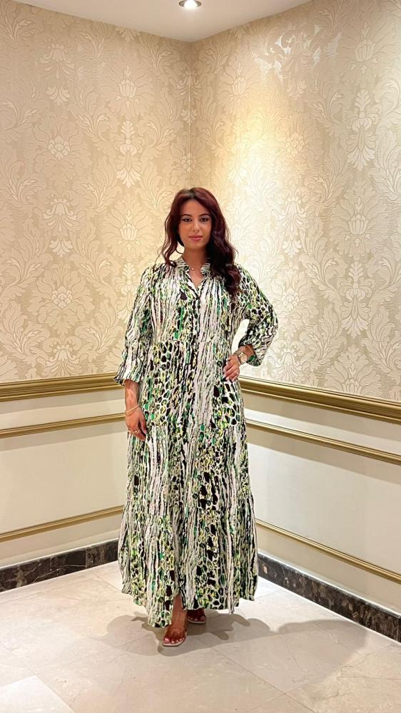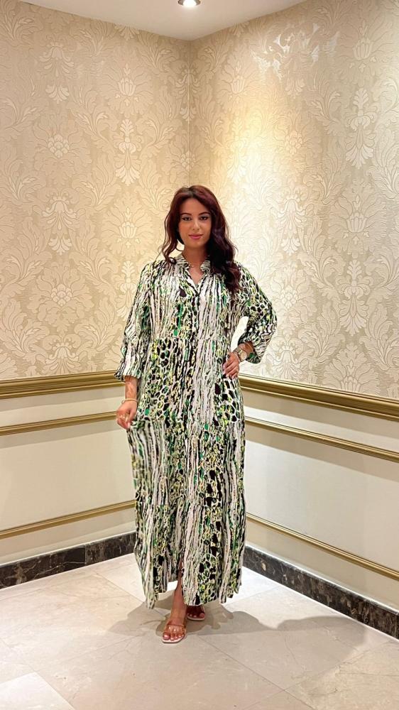 فستان ياسميرا يجمع بين نقشة جلد النمر والخطوط الانسيابية بألوان الأبيض والأخضر والأسود. تصميم مريح وقصة واسعة مثالية لإطلالة جريئة وأنيقة في كل المناسبات.