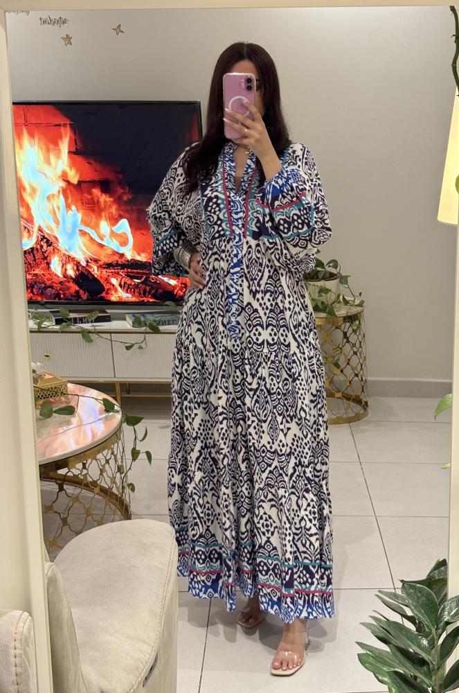 فستان فزكوز بنقشة هندسية شرقية – نعومة وأناقة للمحجبات