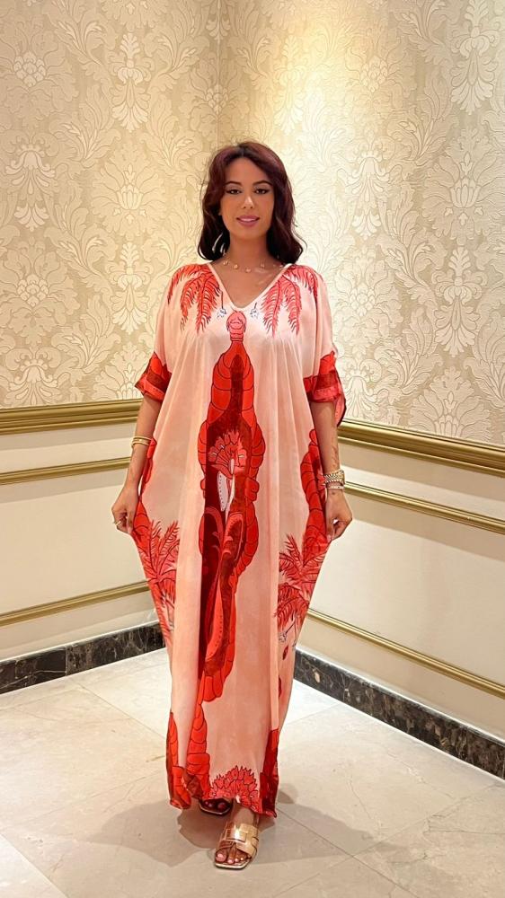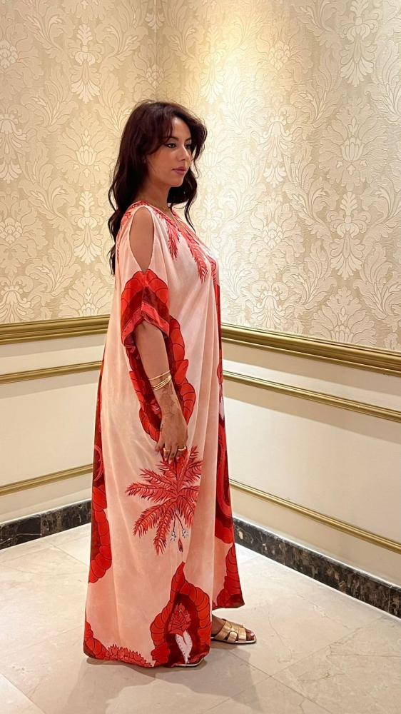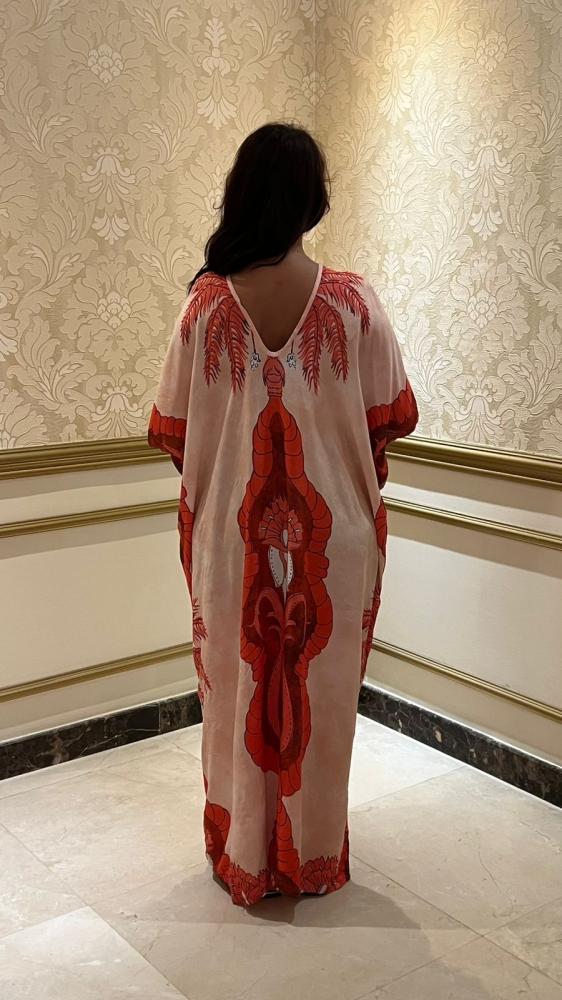 تصميمه الواسع والفضفاض يجعله مناسب للمقاسات الكبيرة بكل أريحية وأناقة، أما النقشة الجريئة بالألوان الحمراء والمشمشية فتضفي عليه طابع فني مميز.