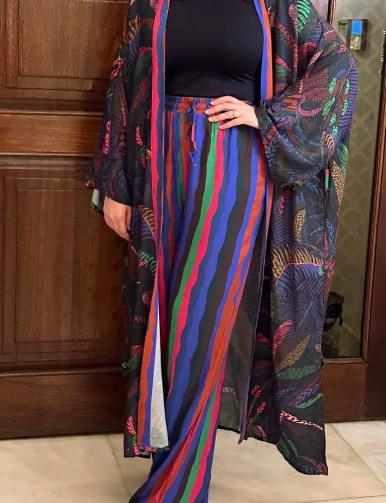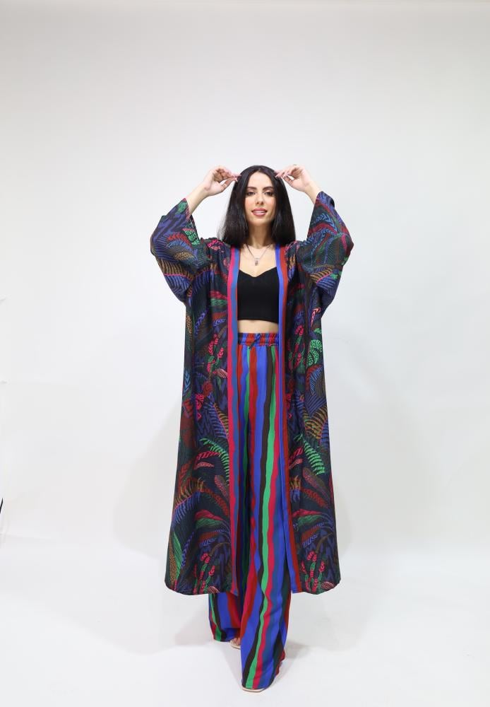 بدلة مكونة من قطعتين مصنوعة في تركيا من القطن الفاخر. يعتبر هذا الستايل من أحدث صيحات الموضة حيت السترة الخارجية بتشجيرات استخدم المصمم فيها ألوان عصرية والبنطلون مقلم بنفس الألوان. مناسب للمحجبات وبإمكانك إضافة حزام لإضفاء ستايل مختلف للمظهر. مريح جدا للصيف، للبحر، للسفر ويعتبر عملي جدا