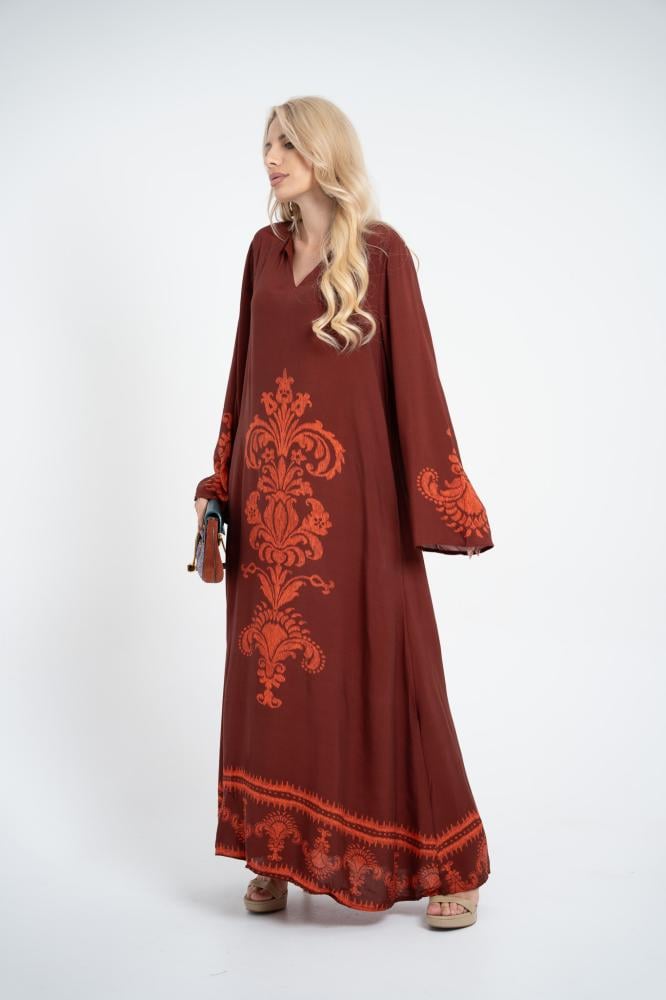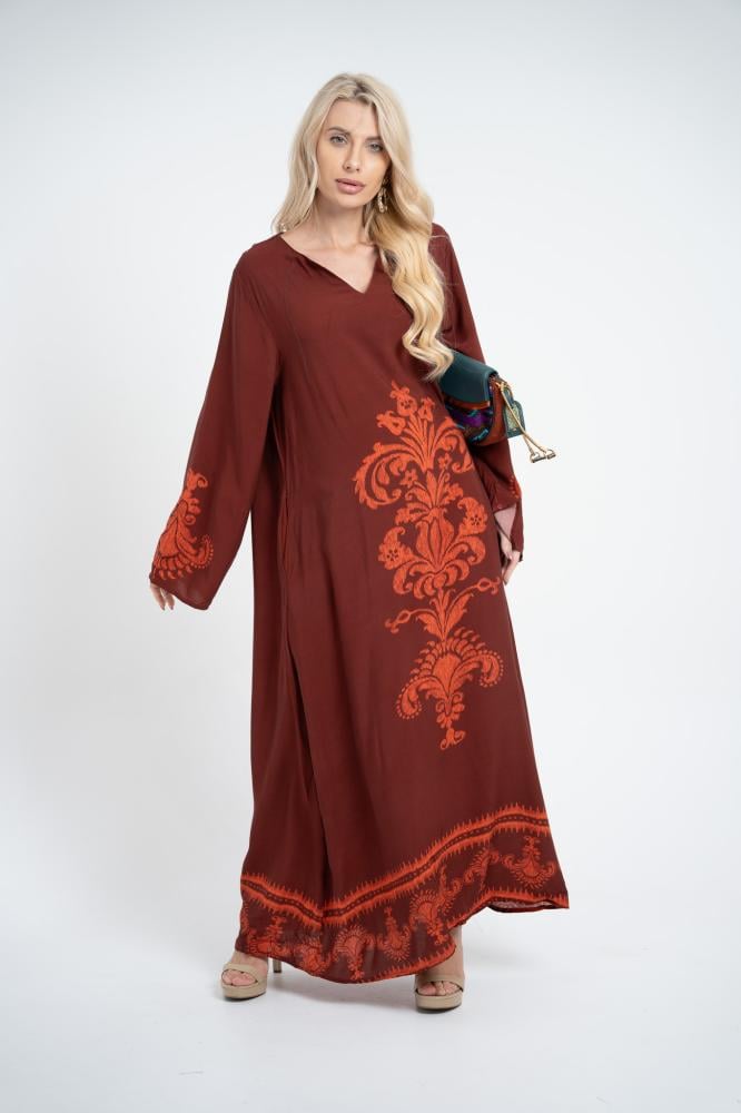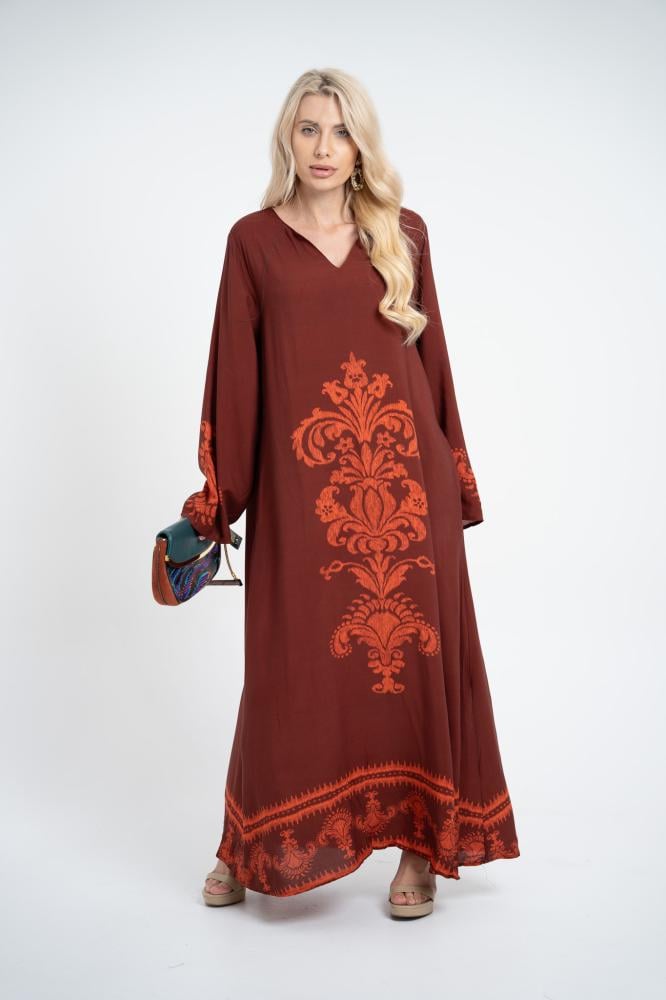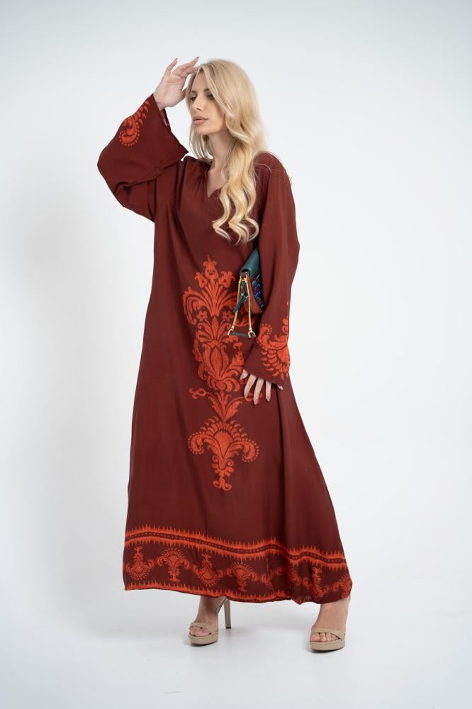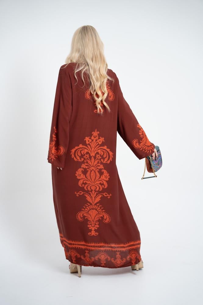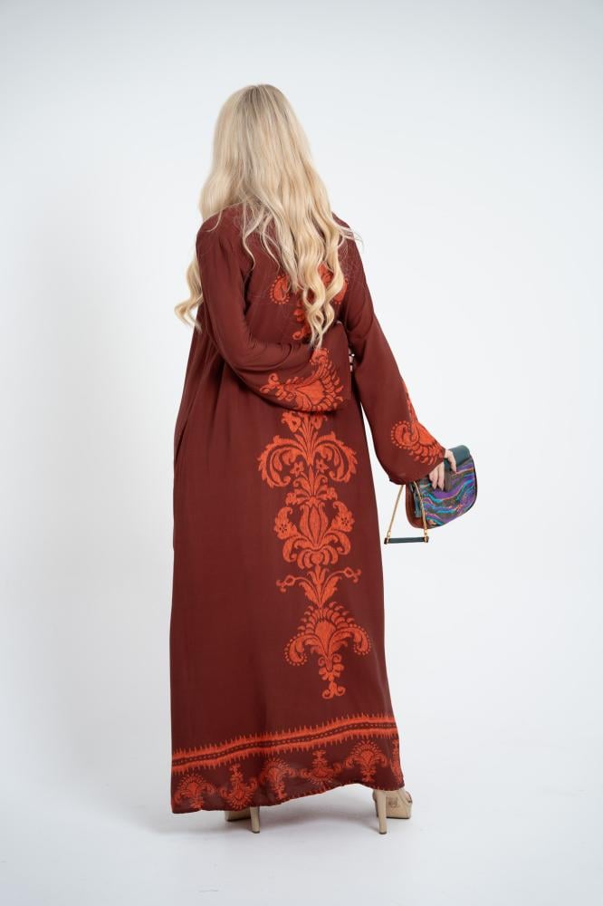 استمتع بأناقة لا مثيل لها مع هذا الفستان الطويل المذهل، الذي يأتي بلون بني داكن يضفي لمسة من الرقي والدفء. يتميز الفستان بتصميمه الفريد الذي يجمع بين البساطة والأناقة، مما يجعله خيارًا مثاليًا للمناسبات المختلفة.