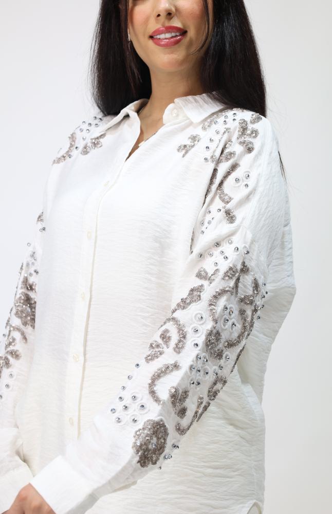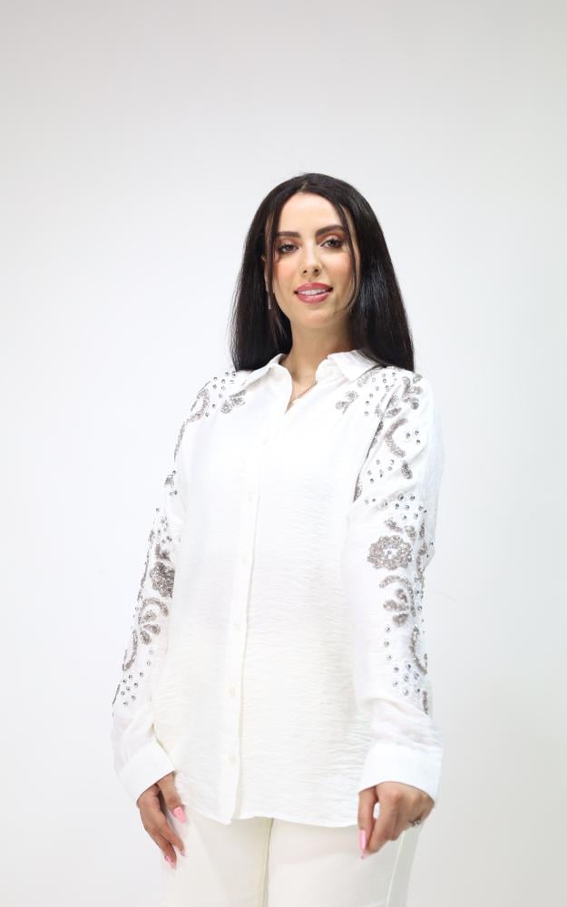 قميص مطرز بكريستالات وأحجار فخمة مصنوع من خامات عالمية ومريحة، صناعة تركية فاخرة.