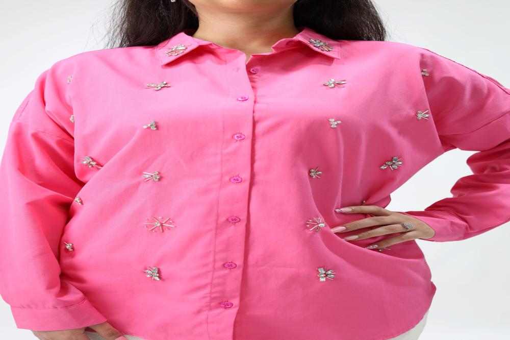 - مزين بتفاصيل مطرزة بكريستالات فاخرة، مما يضفي لمسة من الفخامة والأناقة إلى القميص.