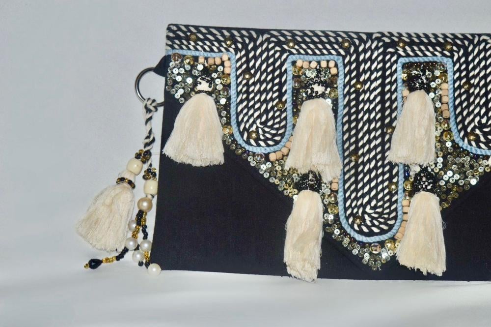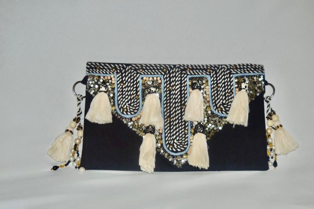 تجمع بين نعومة القماش الأسود الفاخر وتفاصيل الزينة البوهيمية من شرّابات كريمية، خرز متنوع، وتطريز لامع يعكس الضوء بأسلوب جذاب وراقي.