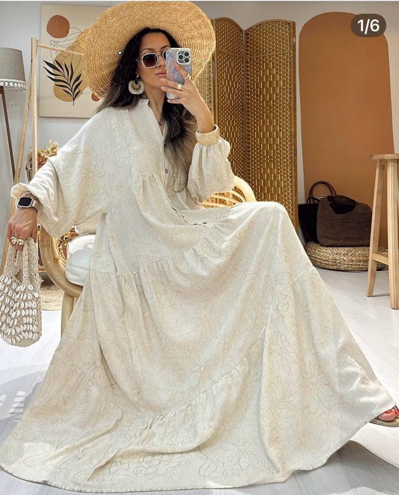 تألقي بإطلالة فاخرة مع هذا الفستان البيج الواسع المطرز بخيوط ذهبية لامعة تضيف لمسة من الأناقة والرقي. تصميمه الفضفاض يمنحك راحة مثالية طوال اليوم، مع أكمام طويلة وأزرار أمامية تعكس البساطة الممزوجة بالفخامة. مناسب للطلعات اليومية، المناسبات المسائية، أو حتى كإطلالة صيفية أنيقة مع قبعة وقباقب عصرية.