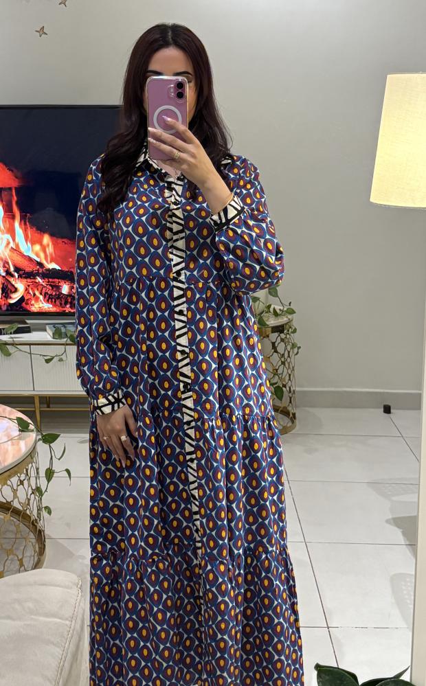 تصميم الفستان بنقشة هندسية عصرية ممزوجة بألوان جذابة كالأزرق والبرتقالي يمنحك طابعاً أنثوياً ملفتاً. قصّته الواسعة والطويلة توفر تغطية مثالية للمحجبات، كما أنه يصلح للمناسبات الخفيفة، السفر، والطلعات الصيفية.