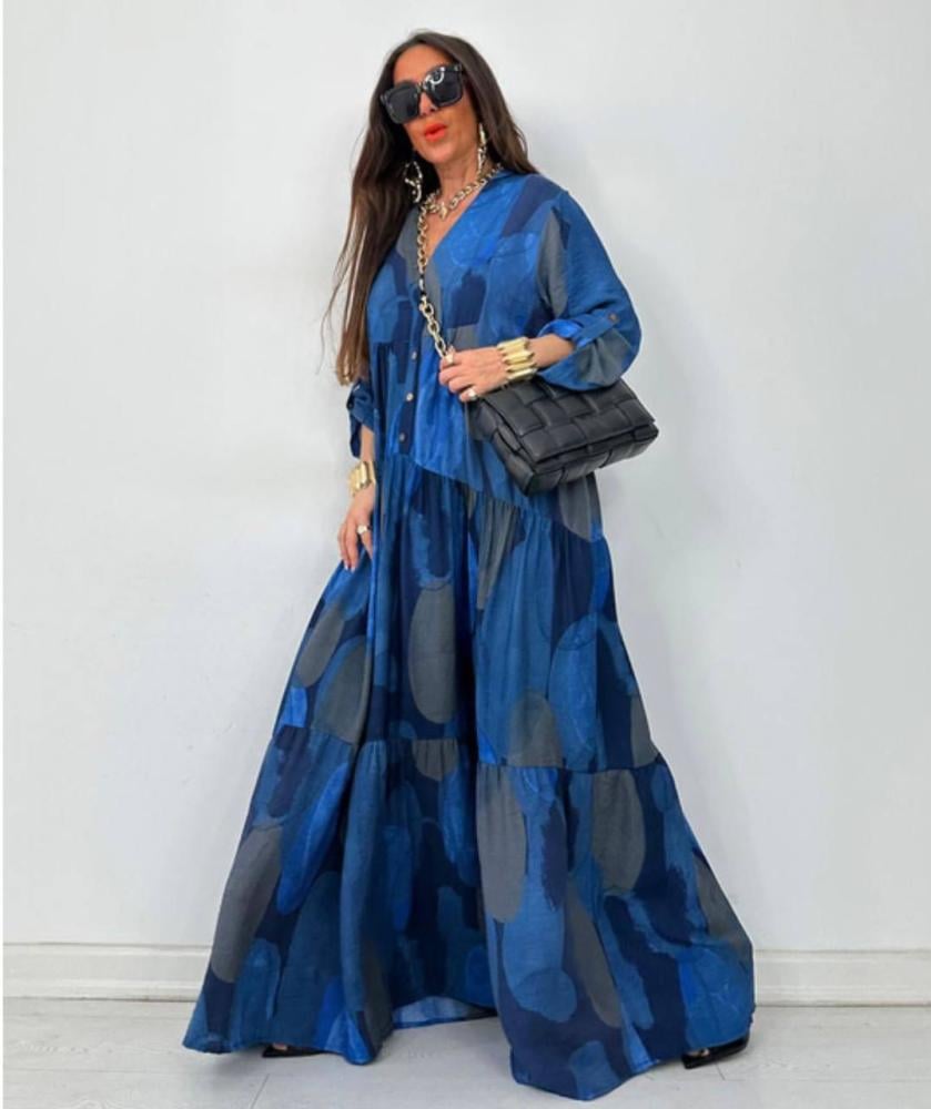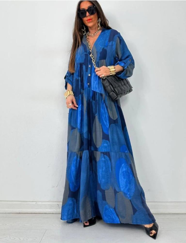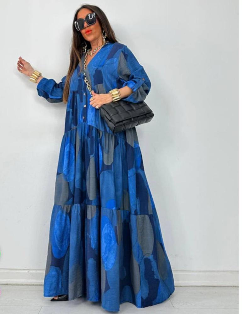 استوحي إطلالتك من عمق البحر وسحر الليل مع فستان “ناردين” الذي يجمع بين فخامة الألوان الهادئة ونعومة القصّة الواسعة. طبعات دائرية متناغمة بدرجات الأزرق والكحلي والرمادي تمنح التصميم طابعًا فنيًا يشبه لوحات التجريد الهادئ.