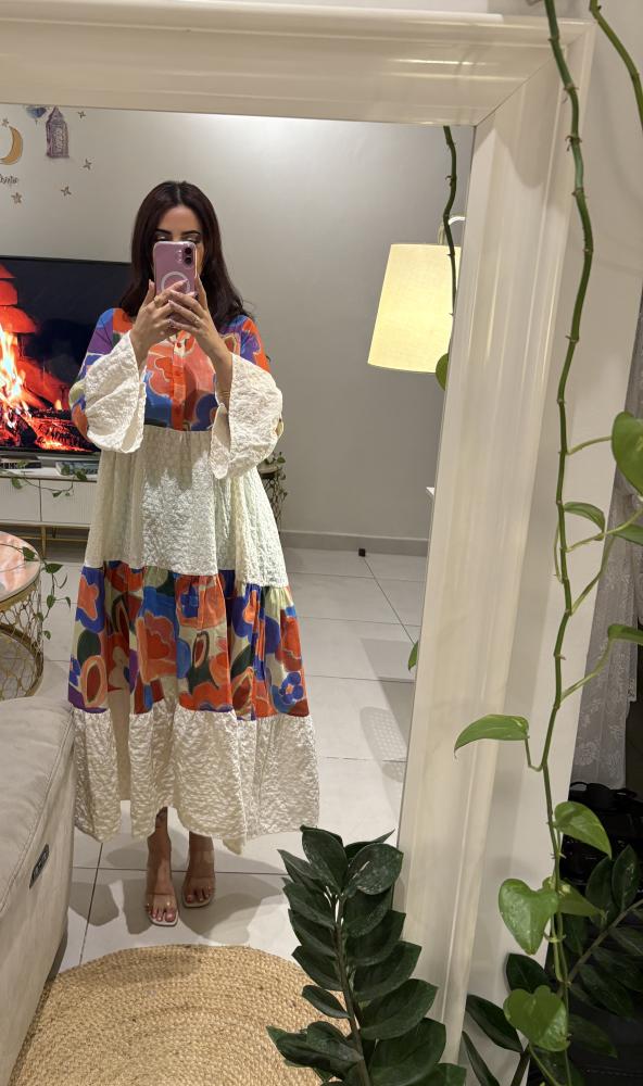 فستان طويل وأنيق مصمم من قماش القطن الناعم، يتميز بنقشات زاهية وملونة تضفي لمسة من الحيوية والأناقة على إطلالتك. التصميم الفضفاض والمريح يجعله خيارًا مثاليًا للإطلالات اليومية أو المناسبات البسيطة.