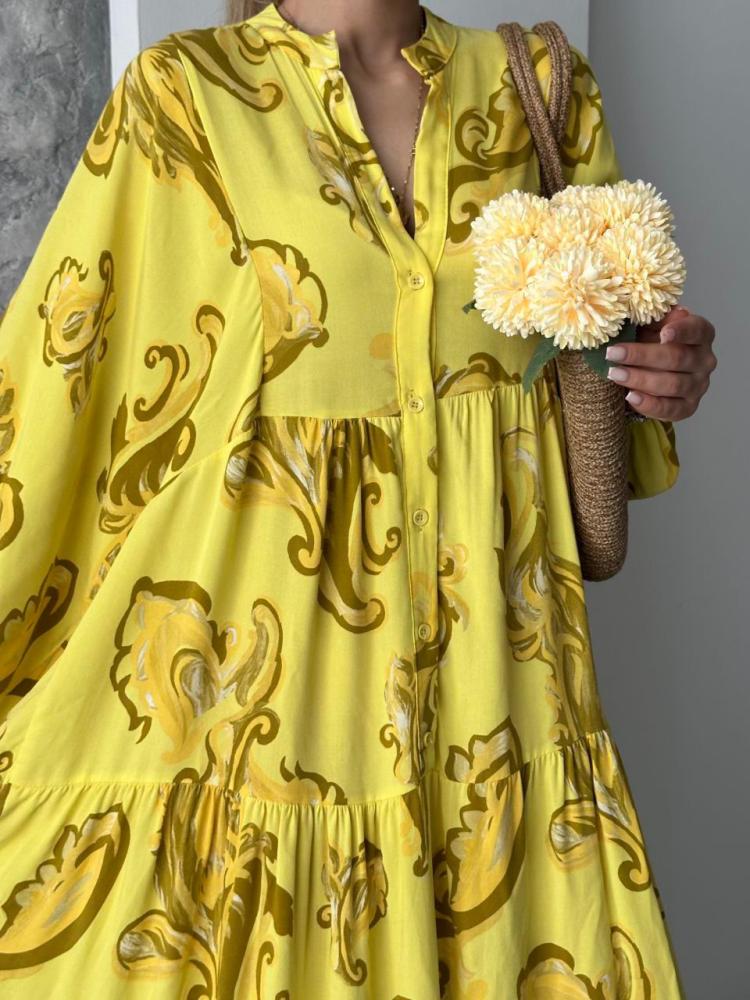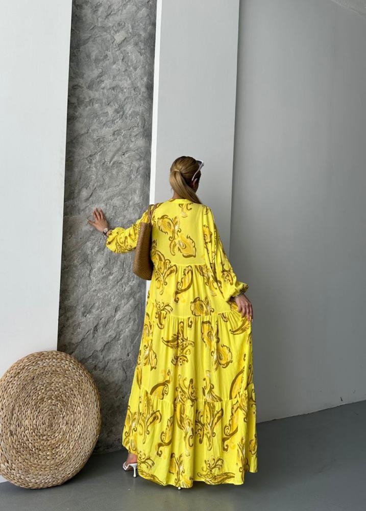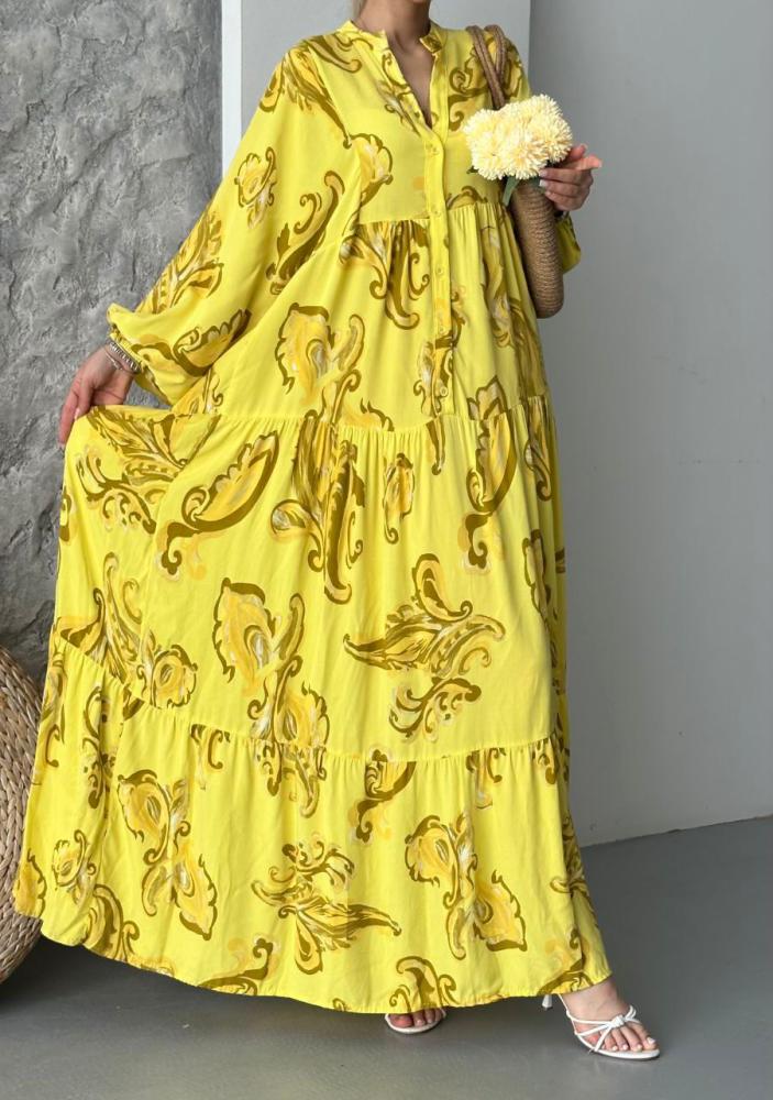 تألقي بألوان الشمس الدافئة مع فستان “ياسمينا”، تصميم ينبض بالحيوية والجمال في كل تفصيلة. الخلفية الصفراء المشرقة تتناغم بروعة مع نقوش ذهبية مستوحاة من الزخارف الملكية، لتمنحك حضورًا ملفتًا وأناقة لا تُنسى.